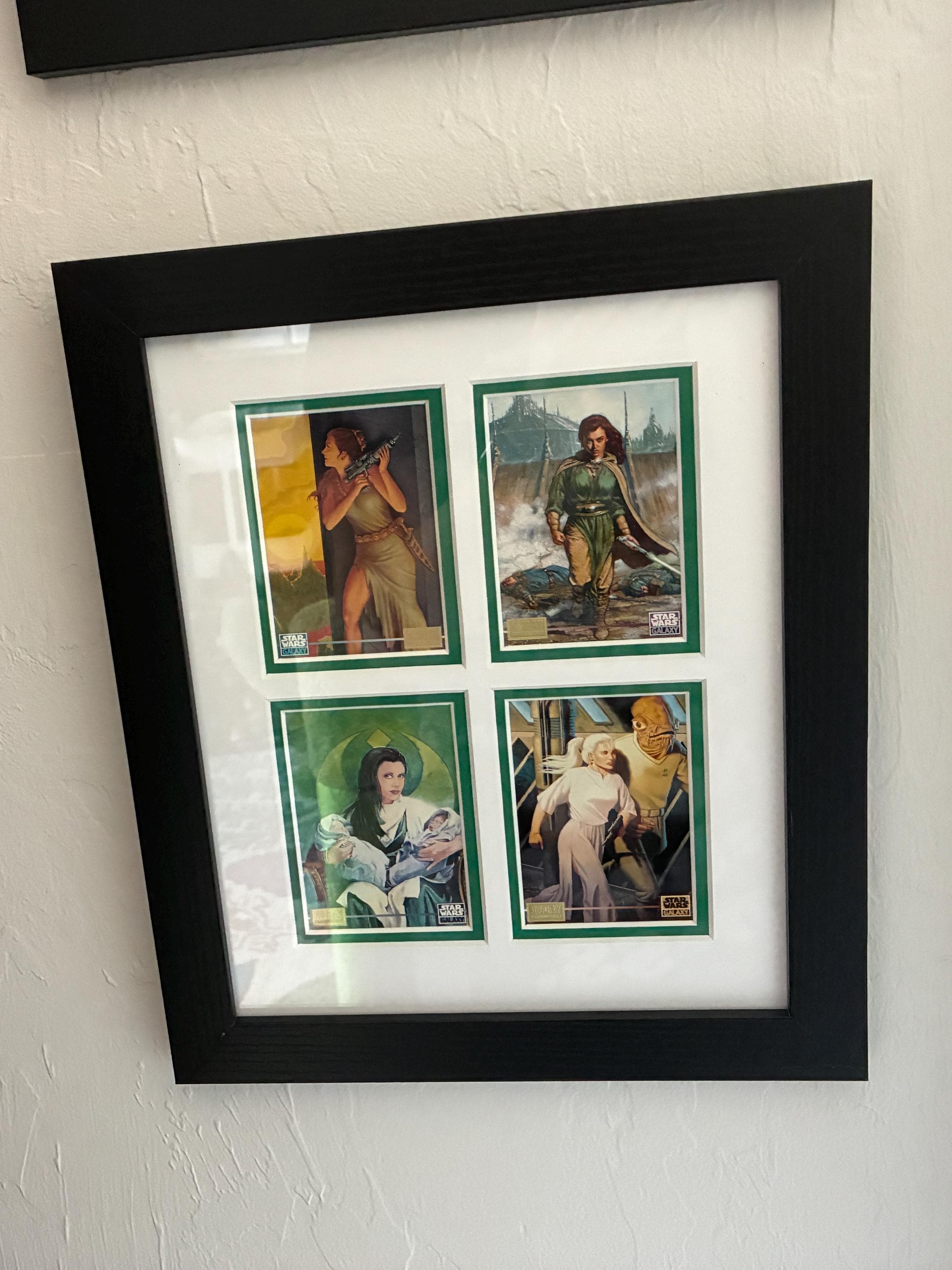 Ordered a mat so that I could frame 4 of my favorite Star Wars Topps cards. The mat arrived very well packaged; I picked white as the top mat to match other prints on the wall, but went with a green inner mat for a pop of color. The green inner mat looks great against the cards.